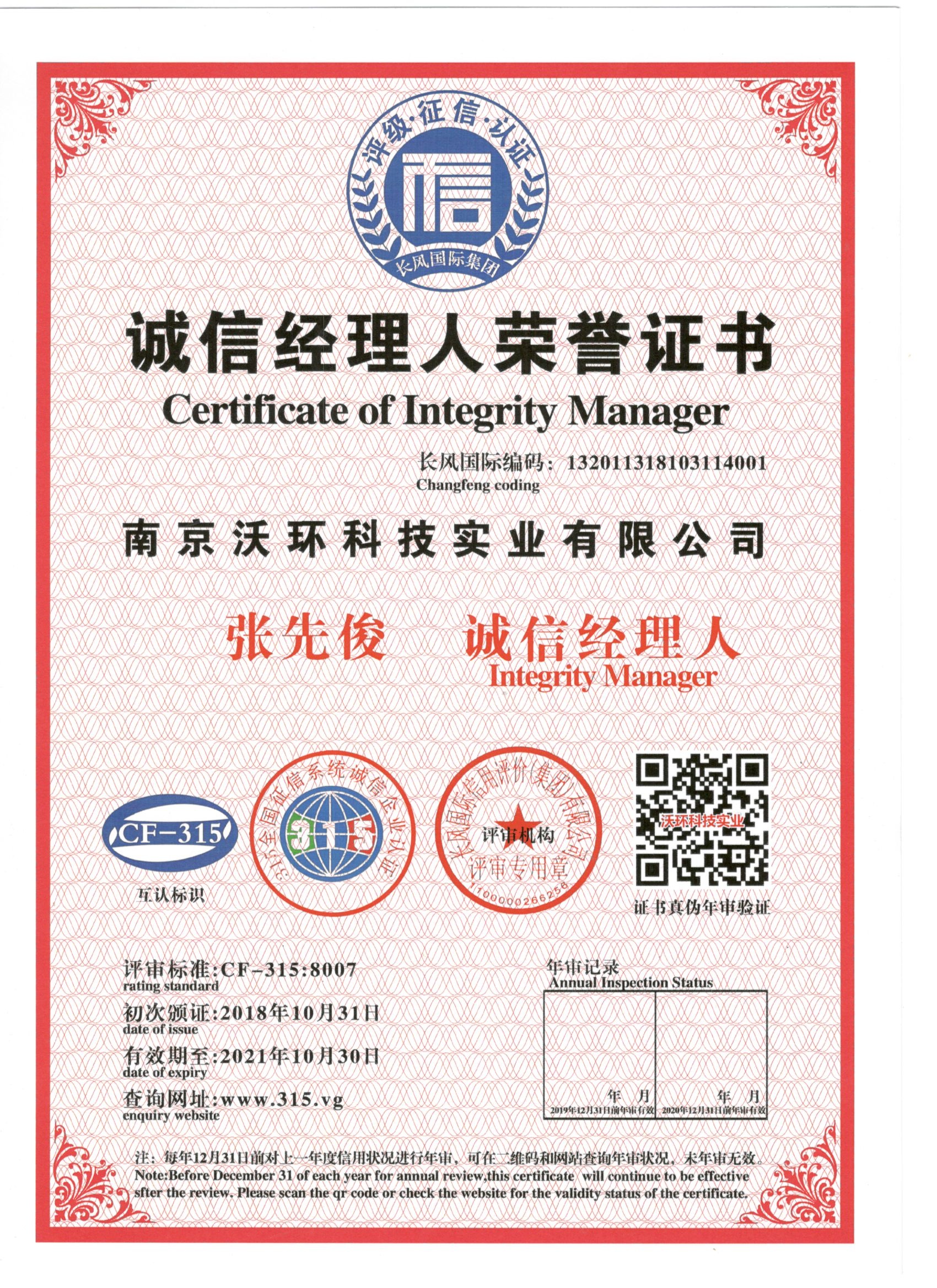 熱烈祝賀南京沃環(huán)公司張先俊先生被專業(yè)評審機構-長風國際集團評為誠信經(jīng)理人,特發(fā)此證書