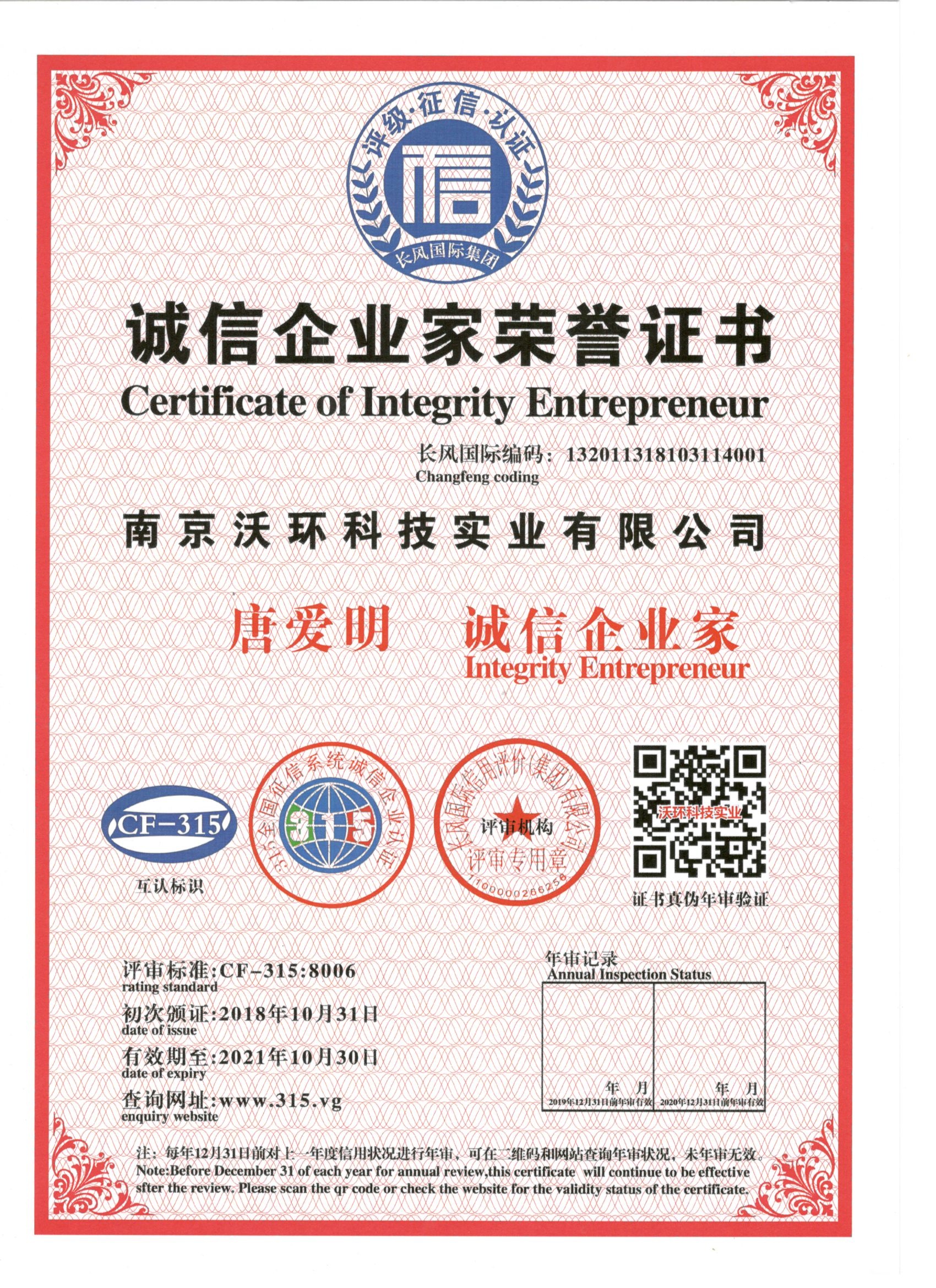 熱烈祝賀南京沃環(huán)公司唐愛(ài)明先生被專業(yè)評(píng)審機(jī)構(gòu)-長(zhǎng)風(fēng)國(guó)際集團(tuán)評(píng)為誠(chéng)信企業(yè)家,特發(fā)此證書(shū)