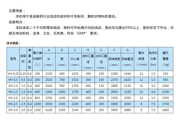 本機用于制藥及其它行業(yè)的粉狀或粒狀物料混合之用。本系列混合機有高效混合型和普通混合型兩種,高效型混合機主要對較細的粉;?qū)δ骋恢髁虾枯^少的物料均能混合均勻;普通型混合機主要適用于一般物料或產(chǎn)量較大的企業(yè)使用。筒體光滑無死角、整機采用不銹鋼材料制作、且外型美觀等特點。